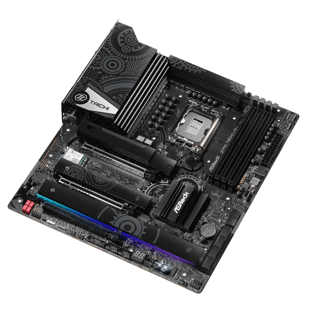 ASRock Z790 Taichi Lite motherboard brings high-end performance and versatility to your build, compatible with Intel’s 14th, 13th, and 12th Gen Core™ processors thanks to its LGA1700 socket and advanced 24+1+2 phase power design. This power architecture, enhanced with Smart Power Stages (SPS) for VCore+GT, ensures reliable performance for overclocking and power-intensive tasks, making it ideal for enthusiasts and professionals alike.