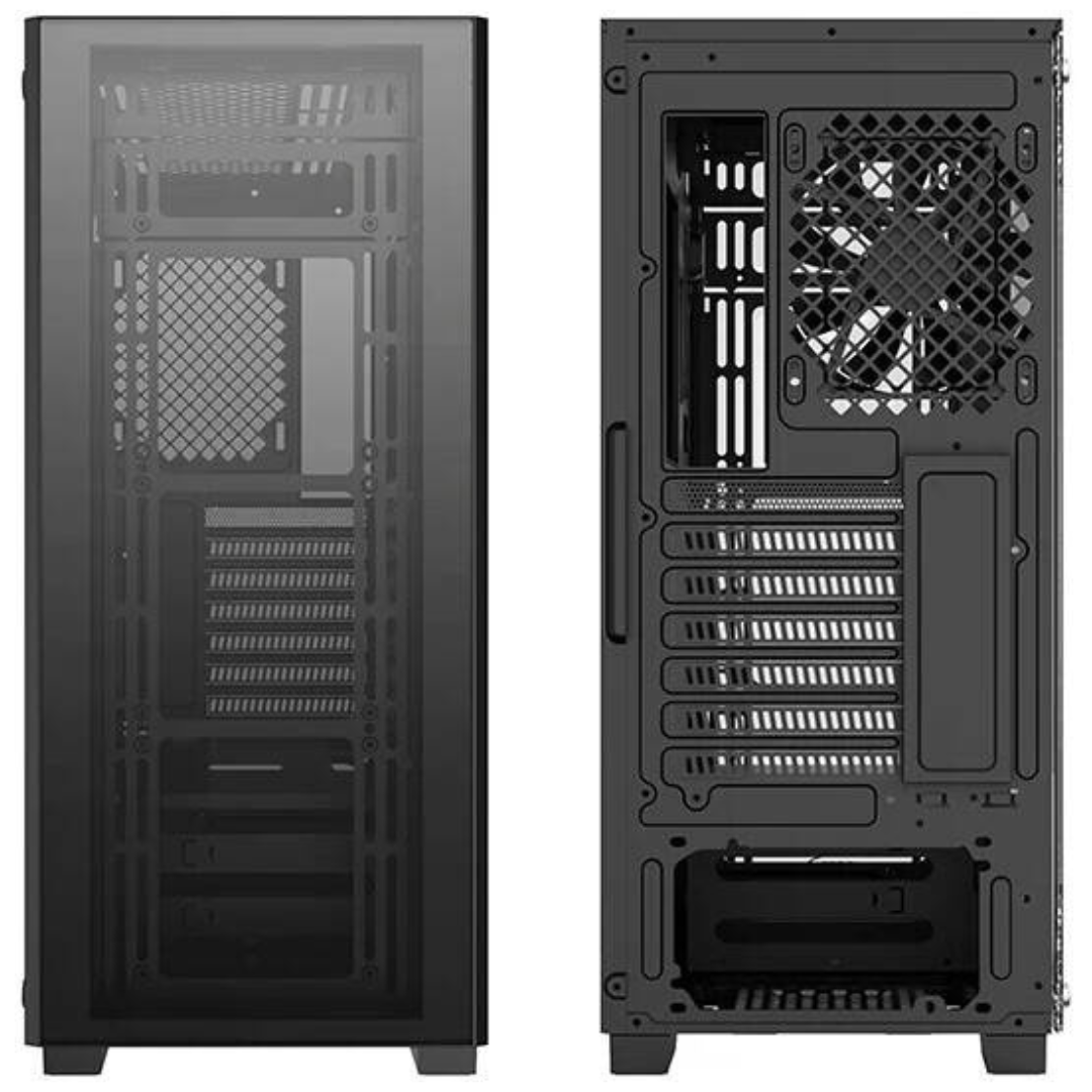 Optimized Airflow: Equipped with an optimized airflow design, the case ensures efficient cooling of internal components. Dual large areas of air-intake on both sides of the front panel promote extreme cooling, maintaining stable system temperatures and preventing overheating for optimal performance.