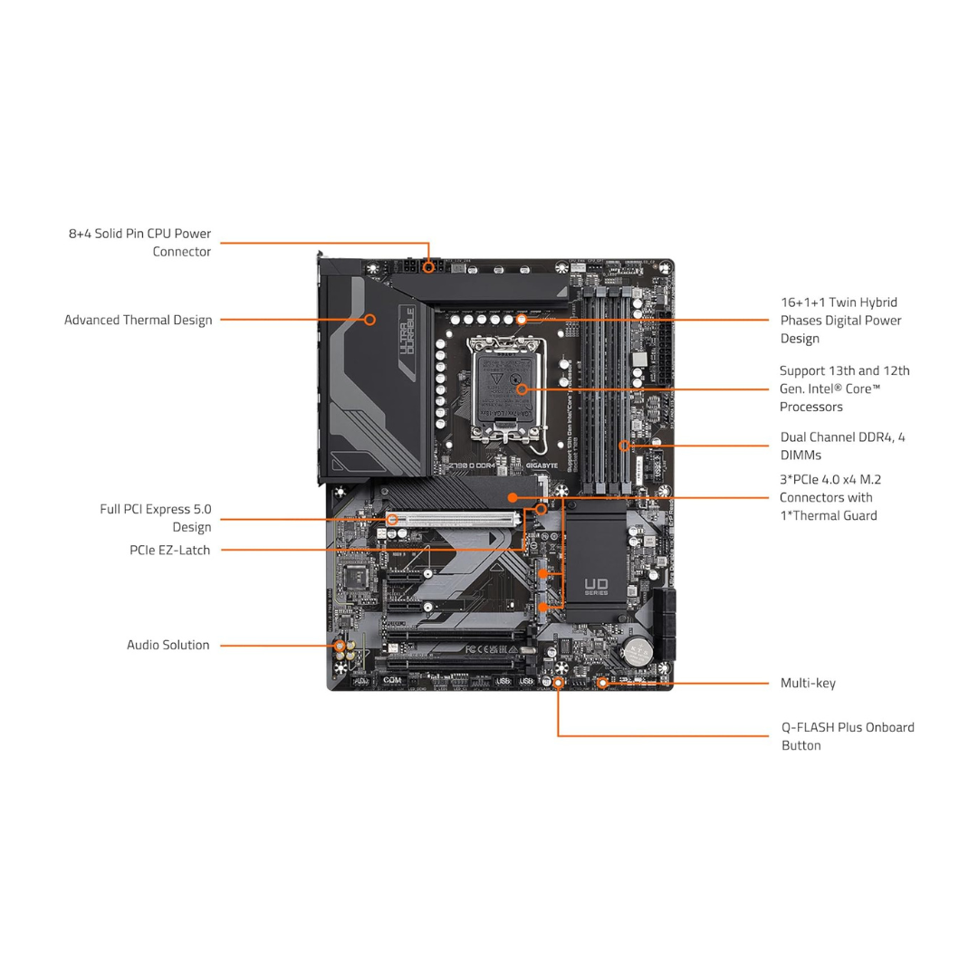 GIGABYTE Z790 D DDR4 Motherboard offers robust performance and connectivity options for Intel® 13th and 12th Gen Core Series Processors, featuring dual-channel DDR4 support and advanced thermal design.